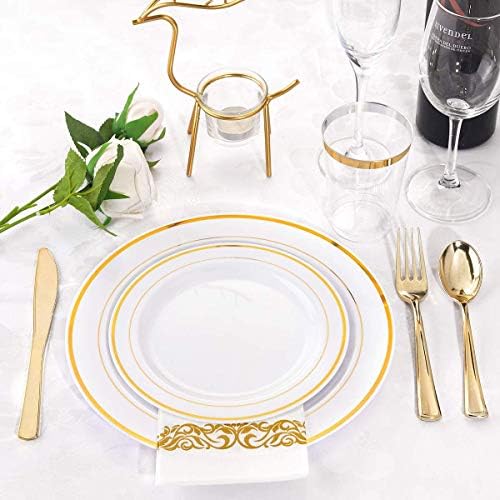 Perfect for any occasion:Gold rim plastic platescan suit for your Birthday, Wedding, Engagement, Party, Banquet Dinner, Catering event, Celeration Party, and Christmas.