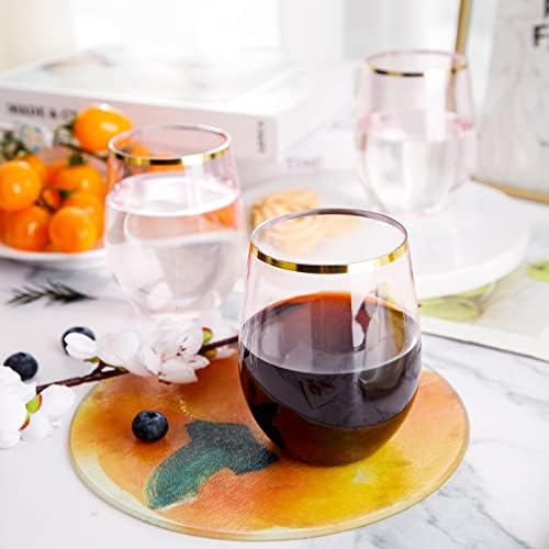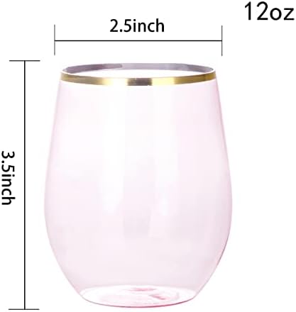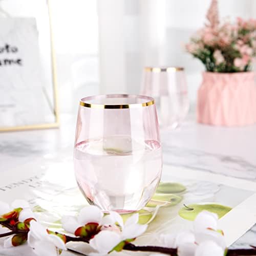 SUT 24Pcs Plastic Stemless Wine Glasses Disposable, 12 OZ Clear Pink Disposable Stemless Wine Cups with Gold Rim, BPA-Free, Recyclable Perfect for Wedding Reception Cocktail Parties and Catered Events