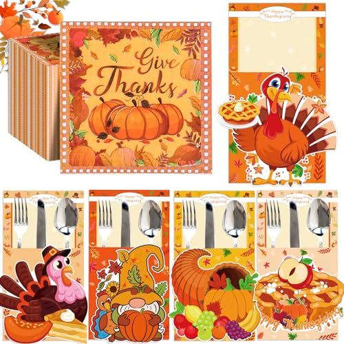Appropriate Size: Thanksgiving Napkins measure 5 x 5 inches (Folded size), and the Thanksgiving utensil holders measure about 19 x 10.5 cm / 7.48 x 4.13 inches, accommodating most standard-sized silverware and utensils.