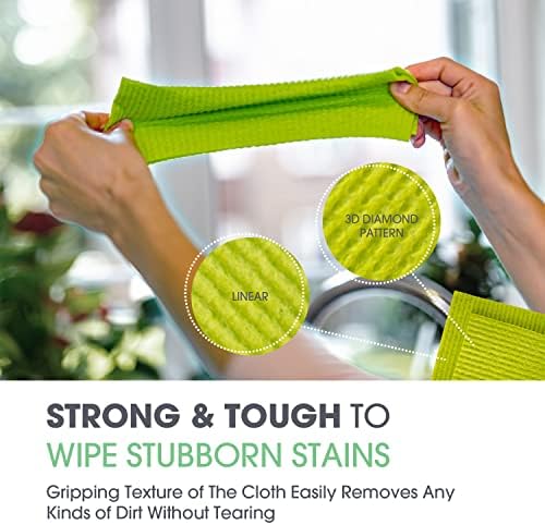 ✅ Our kitchen dishcloths are EXTREMELY STRONG, NEVER TEARING ✅ They are spongy when wet with a STRONG SURFACE for SCRUBBING AWAY ANY DRIED IN MESS WITH EASE. ✅ Gritty and tough when dry allowing you to SCRUB AWAY THE MOST STUBBORN STAINS! ✅ UNLIKE OTHER KITCHEN CLOTHS FOR CLEANING, our cloths NEVER DAMAGE OR STAIN ANY SURFACES! ✅ PERFECT FOR CLEANING dishes, cups, glass, countertops, clothes, sneakers, cars, bikes, ANYTHING YOU CAN THINK OF, OUR SPONGE CLOTH WILL DO THE JOB!