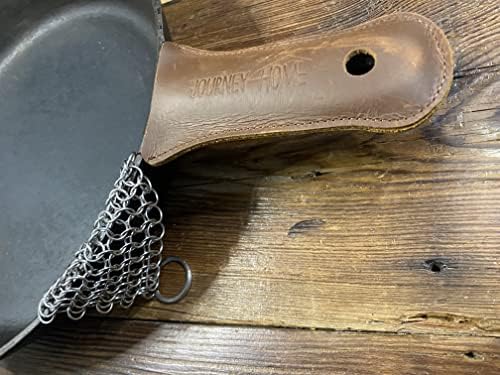 The Journey Home Cast Iron Handle Cover w/ Metal Scrubber – Hanging Skillet Handle Cover – Heat Resistant Leather Pan Handle w/ Hole – Cast Iron Skillet Handle Covers – Great Gift Idea
