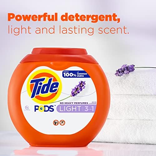 A powerful detergent with a light and lasting scent. New Tide PODS Light Laundry Detergent gives you the deep clean with a scent that’s just right. Designed with no heavy perfumes, Tide PODS Light laundry detergent pacs deliver a crisp, light, and lasting White Lavender scent, while working on 100% of common stains. Tide PODS Light work in any machine and they are designed to dissolve even in cold water. Just place 1 to 2 Tide PODS Laundry Detergent Pacs in the washing machine drum before adding clothing, and you’re good to go. Get the powerful clean of Tide with the convenience and confidence of Tide PODS in every load, every time, for every family. Try Tide PODS Light White Lavender, a crisp, light scent that lets you experience lightness in a whole new way.Keep out of reach of children.