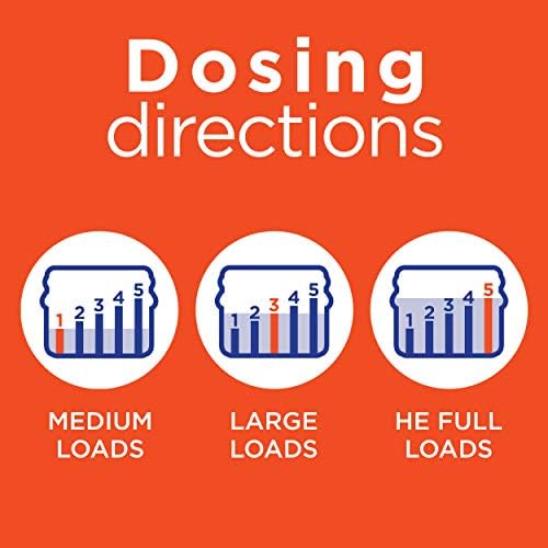 Measure with cap. For medium loads, fill to bar 1. For large loads, fill to bar 3. For HE full loads, fill to bar 5. Add clothes, pour into dispenser, start washer