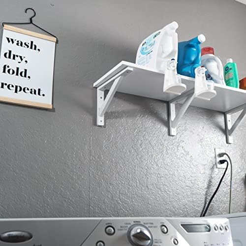 “Does exactly what it’s designed to do. My large soap bottles sit on a shelf above my dryer so I don’t have interference of a washing maching lid opening and hitting it. Would recommend.” – Barbara M.