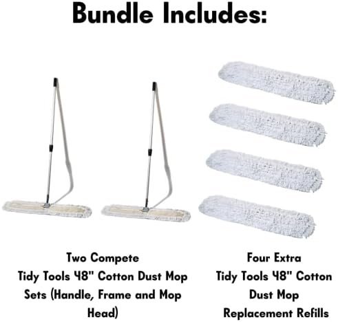 Bundle includes (2) Tidy Tools 48 Inch Cotton Dust Mops with Extendable Metal Handle and Frame and (4) Tidy Tools 48 Inch Dust Mop Refills