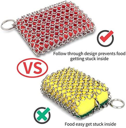 WIDE RANG OF USE Chainmail Scrubber pad has effective cleaning for wide range of uses, you can use it to clean the iron skillet,cast iron pan, grill, kitchen utensils,wok,pie pan, casserole dishes and so on,but please don’t use it to clean stainless steel skillet .