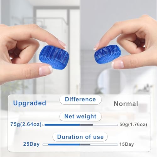 UPGRADED CAPACITY: Long-lasting cleaning effect. Each tablet has been upgraded to 2.65 oz. The larger size of the tablets, along with the use of delayed-release dissolution technology, allows each Blue Toilet Bowl Cleaner to last for up to 21 days of cleaning, with up to 20 flushes per day. One box of Toilet Bowl Cleaner will keep your toilet bowl clean and fresh for a full year. In addition, the life of each tablet varies with the number of flushes and temperature.