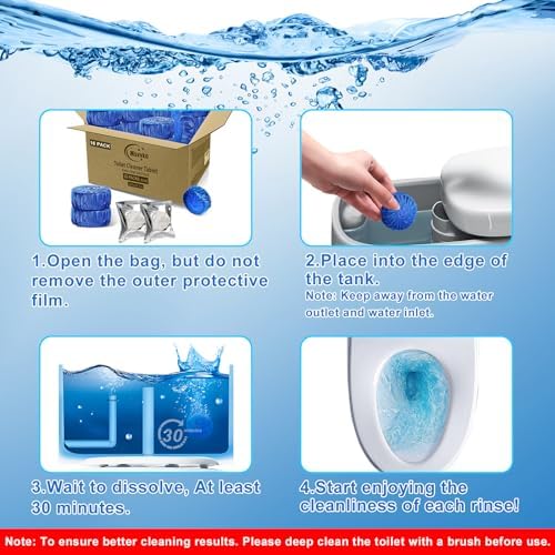 EASY TO USE: The blue toilet bowl cleaner tablets are very easy to use. Simply place a piece of toilet ball in the tank (away from the spout and inlet) and let it fully dissolve for at least 30 minutes, wait for the water to turn into a blue cleaning solution for superb cleaning results, extending the time between deep cleanings and saving time by reducing the need for frequent manual scrubbing of the toilet bowl. (Please note, do not remove the water-soluble transparent protective film).
