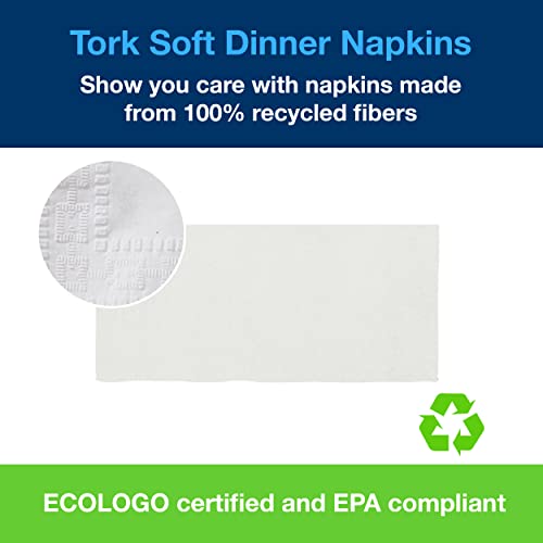 Tork White Soft Dinner Napkin:Enhance your guests’ dining experience with Tork® dinner napkins. With quality look and feel, this embossed, 2-ply white dinner napkin is delivered to you with protective poly wrapping that ensures a perfect front-of-house presentation every time. The Tork exclusive styling allows cutlery to rest on the dinner napkin with little to no overhang.Advantages at a glance:+ Protective poly wrapping+ 100% recycled+ 40% post-consumer fibers+ Ecologo certified+ EPA compliant+ Certified compostable