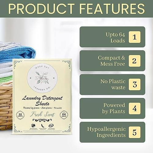 𝗚𝗲𝗻𝘁𝗹𝗲 𝗢𝗻 𝗬𝗼𝘂𝗿 𝗖𝗹𝗼𝘁𝗵𝗲𝘀: Hypoallergenic Laundry Detergent Sheets are Gentle On Your Clothes – Many laundry detergents contain harsh chemicals that can damage delicate fabrics or cause skin irritation. Eco Laundry Detergent Sheets are made with gentle, plant-based ingredients that are safe for all types of clothing and skin.