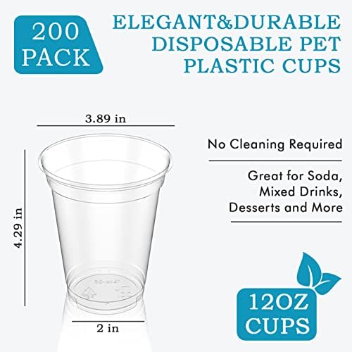 Turbo Bee 200Pack 12oz Clear Plastic Cups,Disposable PET Crystal Dringking Cups,Disposable Plastic Party Cups for Ice Coffee, Smoothie, Slurpee, or Any Cold Drinks
