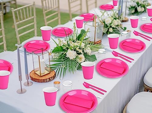 TWOWYHI 175pcs Hot Pink Plastic Party Supplies for 25 Guests Hot Pink Plastic Dinnerware Set of 9" Dinner Plates 7" dessert Plate 12OZ Cups Forks Spoons Knives Napkins for Birthday Wedding Party