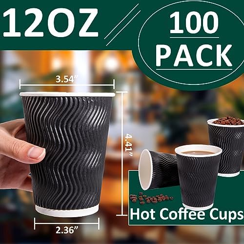 U-QE 100 PCS 12 oz Disposable Coffee Cups, Black Paper Coffee Cups with Ripple Wall, Insulated Disposable Paper Cups for Coffee/Hot Chocolate Drinks, Hot Coffee Cups Perfect for Home, Office and Cafes