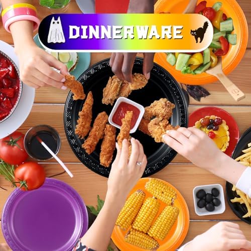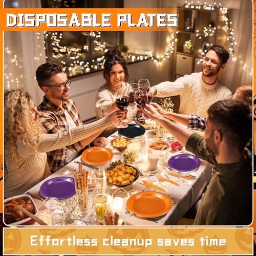 Appealing Halloween Themed Colors: our Halloween disposable party dinnerware set boasts festive, vibrant colors of black, orange, and purple, chosen to match the spookiness of the Halloween season; These vibrant colors add a delightful and scary touch to your Halloween gathering, making your party atmospheric and unforgettable