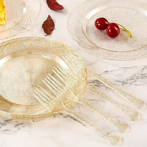 ✅【Elegant Design】Our clear and gold glittering design cake plates with dessert forks are ideal for serving any occasions. The clear transparent shape brings the ultimate elegance to the party, let your guests fall in love with these gold glittering cake plates disposable. This dessert plates can be perfectly matched with silverware and glassware.