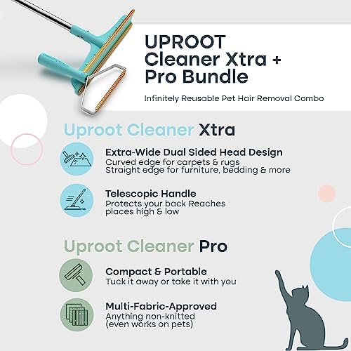 EMBEDDED HAIRS NO MORE – The uproot cat hair remover bundle saves you time & energy. Use the most popular by-demand Uproot Cleaner Pro pet hair for the pet bed, cat tower, rugs, and more, and the Xtra as a carpet scraper for pet hair.