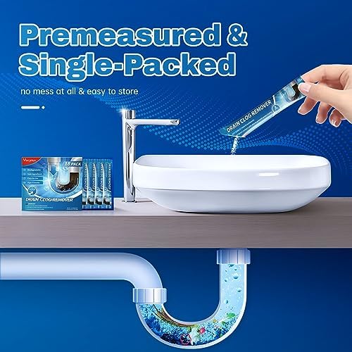 NO MEASURING, NO MESS: Each package contains 18 pre-measured powder packs. Being individually wrapped, Vacplus sink clog removers are handy-to-use and easy to store. No measuring is needed, they make clearing a slow-flowing drain just an easy thing — pour a pack down into the drain, add hot water and wait 15-30 minutes before flushing with clean water (or wait overnight for tough clogs).