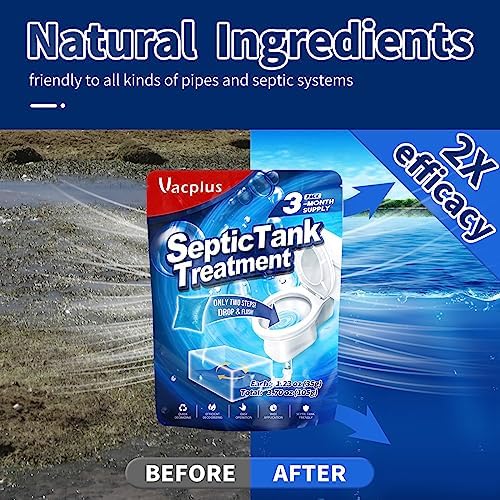 EASY OPERATION: Vacplus septic treatment is super convenient to use for maintenance. You only need to monthly drop a pack into the downstairs toilet bowl and flush the toilet until the pack is swept away. Each pack of Vacplus septic tank cleaner lasts for 1 month in a septic tank of 1000-1500 gallons, and the 3 packs in total can continuously clean septic tanks for 3 months.