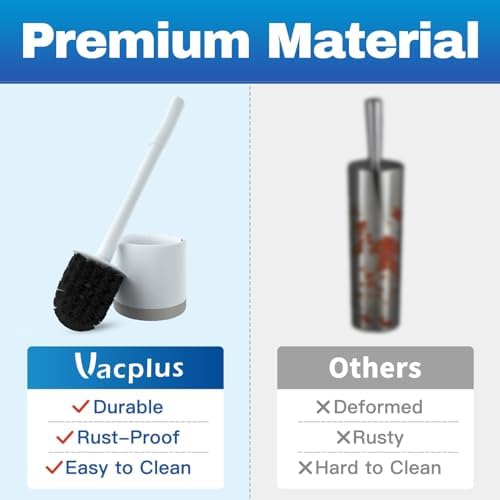 PREMIUM MATERIAL: Vacplus toilet brush and holder set is the perfect alternative to those metal toilet brushes that are easy to rust and deform. This toilet brush holder kit is made of durable, sturdy, rustproof ABS material, which won’t get brittle or corroded with repeated use. It is also super easy to clean. Simply rinse it under running water and air dry.