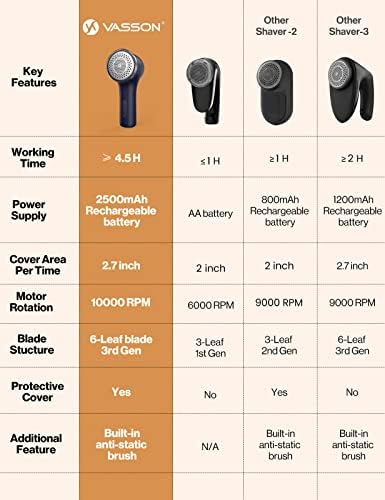 ✅100% Satisfaction Guarantee: As a professional fuzz remover manufacturer, we keep your safety and protection in mind to prevent accidental snagging or cutting fabric. The protection mechanism will automatically cut off power to ensure safety when the protection cover is loose or not closed properly. All VASSON products are backed by our 12-month warranty. If you have any issues or questions about the product, then please contact us anytime