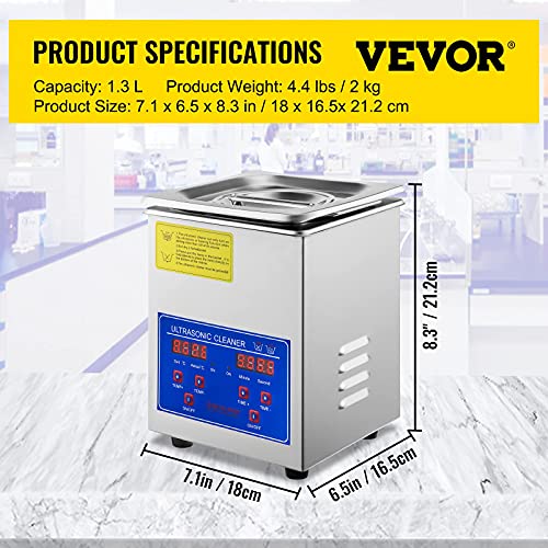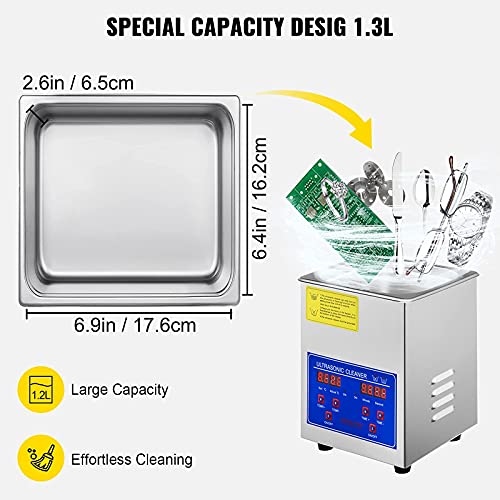 Material: 304 Stainless SteelTank Capacity: 1-1.3L (Since the bottom of the ultrasonic cleaner is a curved surface, the actual volume will be smaller.)Ultrasonic Frequency: 40kHzUltrasonic Power: 60WPower Supply: AC110V 60HzTime Setting: 0-30 min (LED Digital Display)Transducer Quantity: 1 setTank Size (L x W x H): 6.9″ x 6.4″ x 2.6″ / 17.6 x 16.2 x 6.5 cmProduct Size (L x W x H): 7.1″ x 6.5″ x 8.3″ / 18 x 16.5 x 21.2 cm