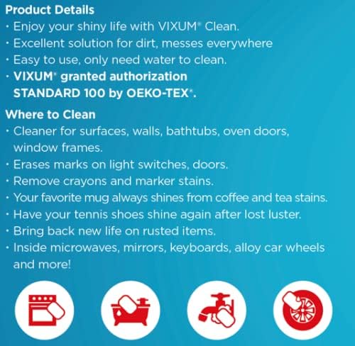 Product Details – Enjoy your shiny life with VIXUM Clean – Excellent solution for dirt, messes everywhere – Easy to use, only need water to clean – VIXUM granted authorization STANDARD 100 by OEKO-TEX Where to Clean – Cleaner for surfaces, walls, bathtubs, oven doors, window frames – Erases marks on light switches, doors – Remove crayons and marker stains – Your favorite mug always shines from coffee and tea stains – Have your tennis shoes shine again after lost luster – Bring back new life on rusted items – Inside microwaves, mirrors, keyboards, alloy car wheels and more! Not Recommended – High gloss, polished, dark, brushed, satin, faux, bare/polished wood, non-stick coating and copper surfaces, stainless steel appliances, non-stick coating, vehicle body, display screens and computer screens Caution – Test a small area with light pressure before use – Do not use with chlorine bleach or other household cleaners – DO NOT USE ON SKIN OR OTHER PARTS OF THE BODY. USING ON SKIN WILL LIKELY CAUSE ABRASIONS. – KEEP OUT OF REACH OF TODDLERS AND PETS TO AVOID ACCIDENTAL INGESTION.