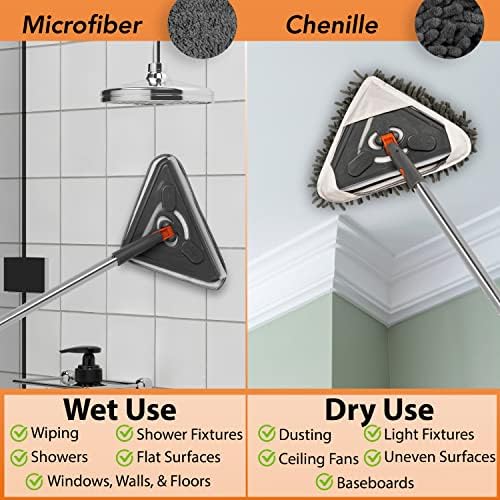 This wall mop with adjustable extension pole can be used for multiple uses and areas. Comes with five rods that can adjust the height that is convenient for your cleaning chore. Being able to adjust the length of the mop will save you from bending over and being able to reach high areas without using a step stool or ladder. Made of high quality steel that wont bend and gives you a strong support while using. The triangle head rotates making it easy to get to hard to reach corners. Lightweight and mop heads can be removed easily and are machine washable. You will get 3 microfiber pads and 3 chenille pads. Enjoy the benefits of reaching ceiling fans and light fixtures as well. Can scrub and wash walls, ceilings, car, shower, and floor.