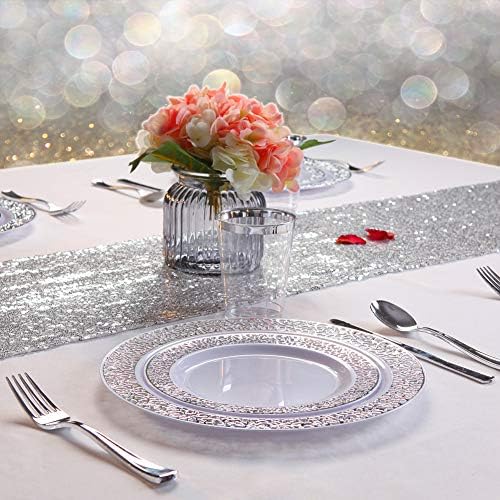 ELEGANT DESIGN: Modern and lace plastic disposable plates designed to give your table settings an amazing and gorgeous look. Our 25 Dinner Plates, 25 Salad Plates, 25 Forks, 25 Knives, 25 Spoons, 25 Plastic Cups, Idea for 25 guests, sturdy construction resists breakage, bending.