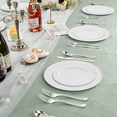 ALL-INCLUSIVE DINNERWARE SET: WDF white and silver plastic plates includes 40 dinner plates, 40 salad plates, 40forks,40knives,40 spoons . Sturdy construction resists breakage,bending,and snapping.