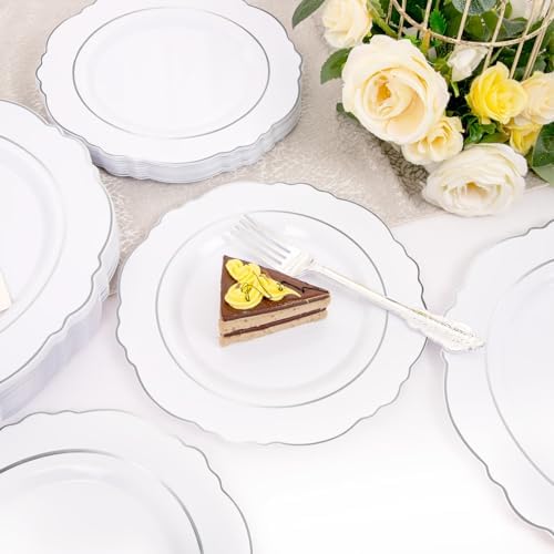 [ELEGANT LACE DESIGN] : These white and silver plastic plates have an elegant and unique baroque design, which is a favorite choice for everyone who loves parties. They can create an elegant and stylish exquisite banquet for you, and make your silver plates and silver plastic cutlery stand out in the party.