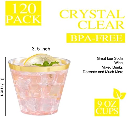 120pcs disposable plastic cups for 120 guests, very suitable for family gatherings, birthday parties, weddings, business events, graduations and other occasions, these golden plastic cups can be used by just rinsing them with water a little and throwing them into the trash can after use, very convenient.