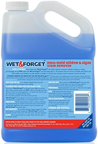 Wet & Forget is an outdoor cleaner that eliminates black and green stains caused by moss, mold, mildew and algae without any scrubbing, power washing or bleach. Just mix 5 parts water with 1 part Wet & Forget in a pump up garden sprayer. Fully saturate a dry surface with Wet & Forget on a cool dry day and leave it. That’s it! Just wet it and forget it. Wet & Forget goes to work with the wind and rain to gently clean the surface over time. Green stains generally clean up within a few weeks, a few days with rainfall. Black stains or heavy stubborn stains may take 6-12 months to fully clean up. Be Patient, Good Things Take Time! Wet & Forget properly cleans surfaces, so they are likely to stay clean up to 1 year or longer. Repeat application yearly or when new stains appear to maintain a clean surface. Wet & Forget contains no bleach and is safe to use on any outdoor surface including any type of deck, siding, roof, walkway, patio, brick, and cement. Gallon Concentrate makes 6-Gallons and covers 750 – 2,250 sq. ft. depending upon severity of the stain and porosity of the surface. Wet & Forget – the easy way to clean all your outdoor surfaces