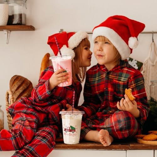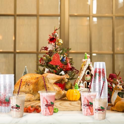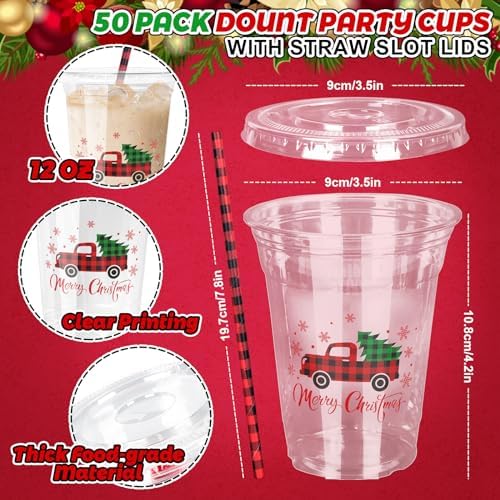 Whaline 50Pcs Merry Christmas Party Cups Plaid Truck Snowflake Tree Disposable Clear Plastic Cups with Flat Lids Plaid Straw Party Supply Drinkware for Xmas Decor Coffee Beer Beverage Snacks Candies