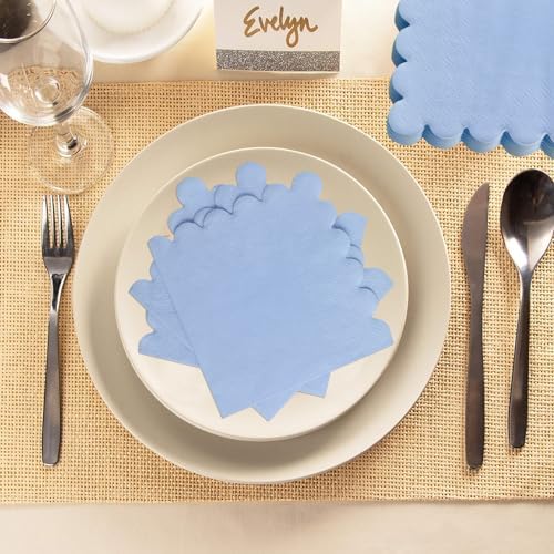 WNINK 50 Pcs Light Blue Scalloped Cocktail Napkins Beverage Napkins Dessert Napkins Disposable Paper Napkins for Birthday, Wedding,Anniversary Party, Baby Shower, 5 x 5 Inch Folded