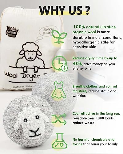 SOFTENS LAUNDRY NATURALLY: This Wool Dryer balls are a reusable, eco-friendly, and sustainable alternative to traditional fabric softeners and dryer sheets. Our dryer balls are made from 100% natural, ultrafine organic wool, which is of high quality, strength, and luster, and is more durable in moist conditions. No chemicals or synthetics used. Use of a laundry ball is great for those with sensitive skin & babies.
