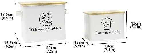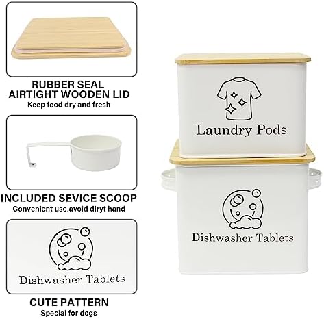 Xbopetda Set of Laundry Powder Bin & Dishwasher Pod Holder, Laundry Detergent Powder Storage Box with Scoop Wooden Lid & Handles, Metal Dishwasher Tablets Bin for Home Organization and Storage