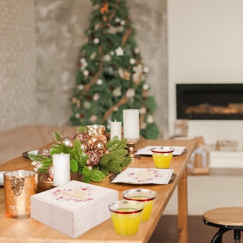 Yaomiao 100 Set Christmas Plastic Cups Cocktail Napkins 9 oz Red Rimmed Disposable Wine Glasses Golden Merry Christmas Paper Napkins Cocktail Cups Napkins Set for Christmas Party Decoration Supplies