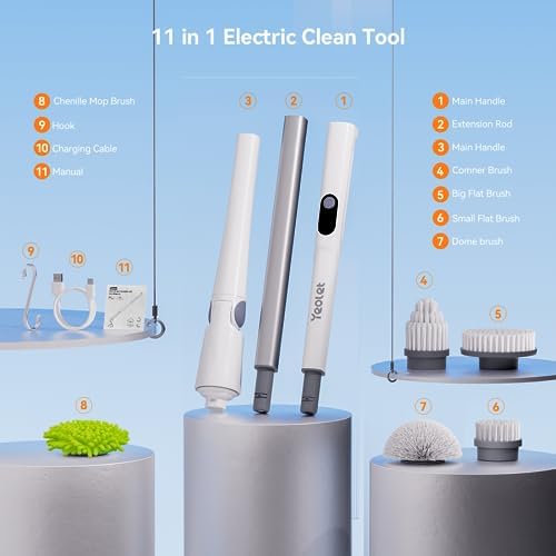 5 Detachable & IPX7 Waterproof Brush Heads: Yeolet power scrubber has 5 replacement brush heads including dome brush, large/small flat brush, chenille mop brush, corner brush. Each brush easily reaches into different corners and removes stains from pool, shower bathroom, tub, toilet, gutters, baseboards, door frame tiles. IPX7 waterproof brushes better protect themselves from damage in wet environments. Tips: Please don’t submerge the entire machine in water.
